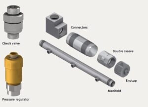 The check valve, pressure regulator, manifolds and connectors are all designed and equipped with the O-ring sealing mechanism. With a few twists of the wrist, and minimal force, all components are assembled by hand without needing special mechanical tools or additional sealants, such as hemp string or teflon tape.